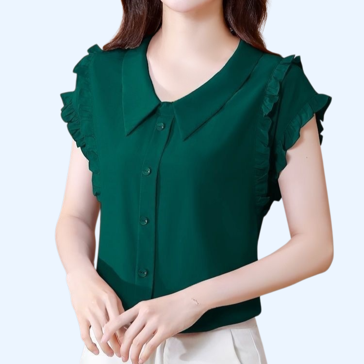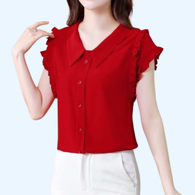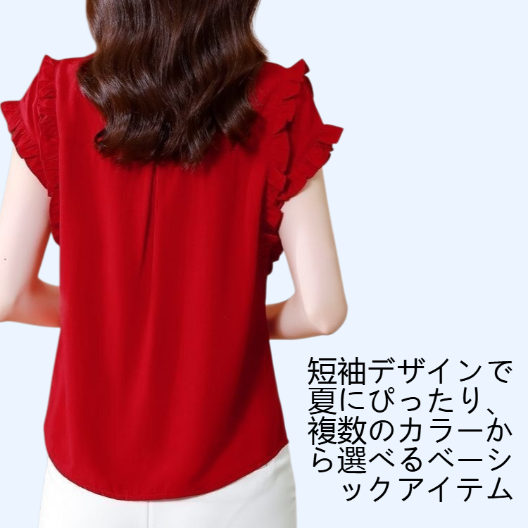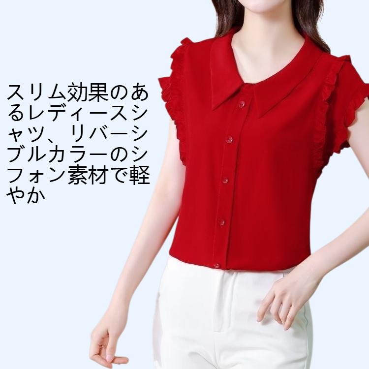 軽やかなシフォン素材で通気性抜群。着痩せ効果のある襟デザインと半袖仕様で夏に最適。オフィスやカジュアルにも対応。